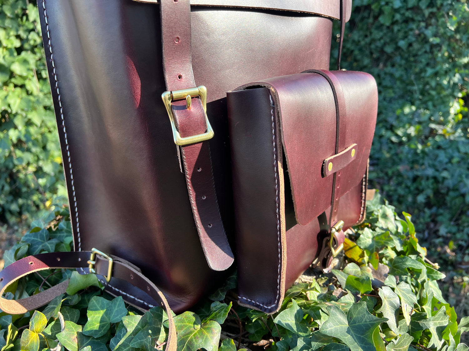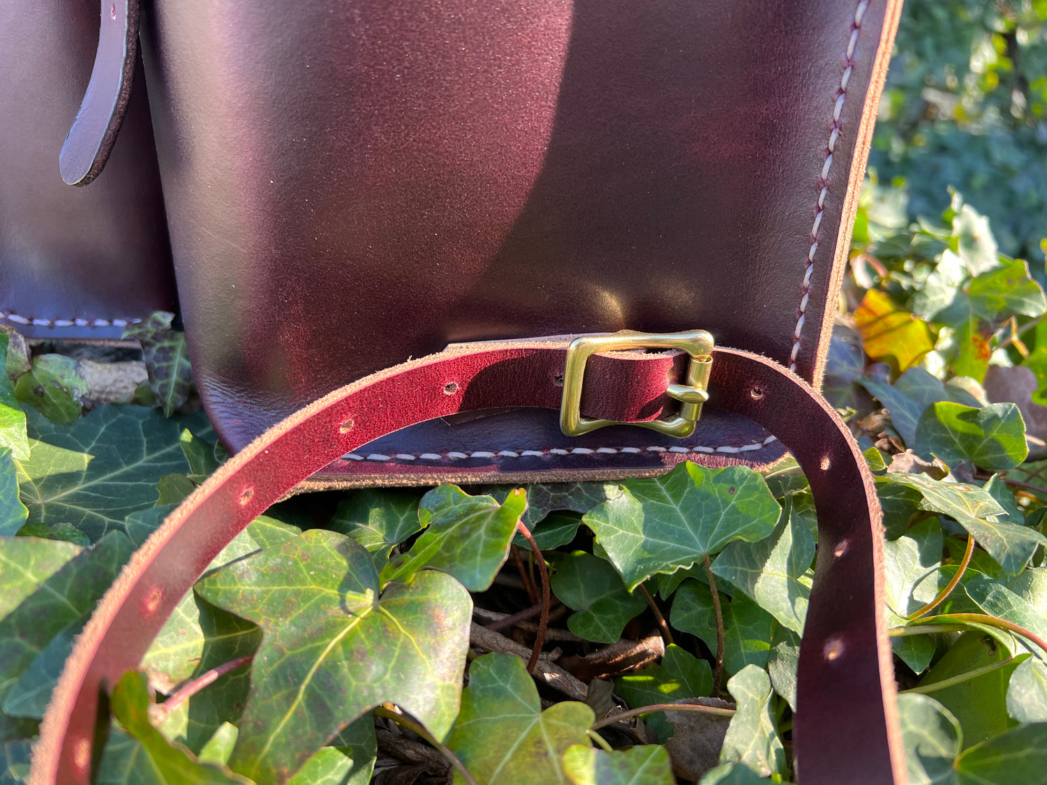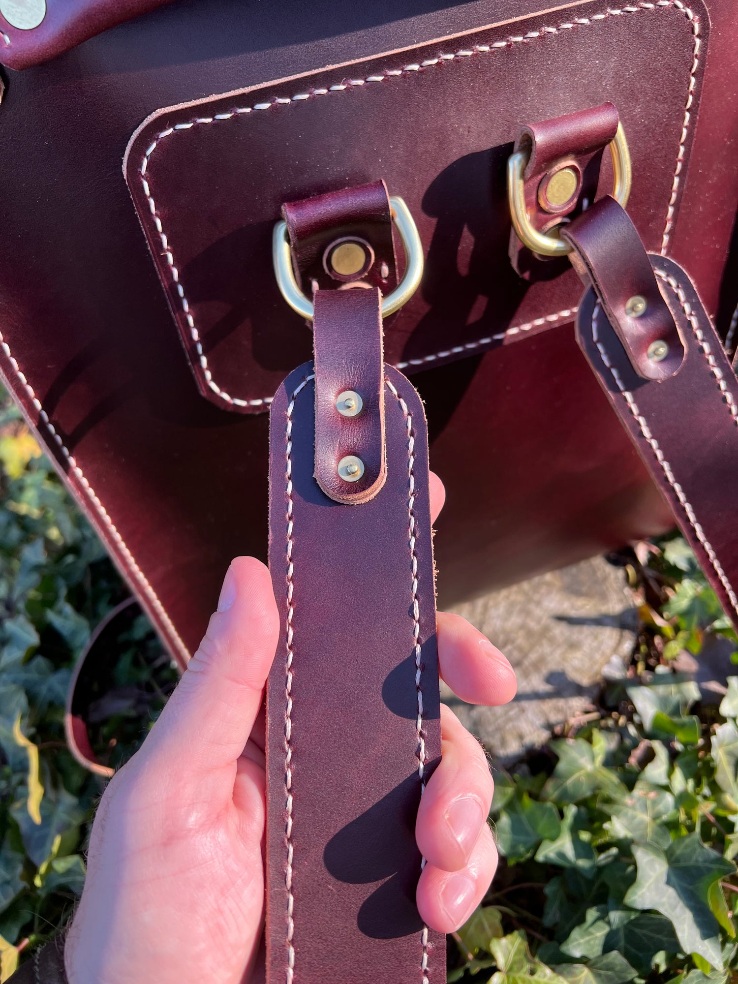 Ritza Tiger Thread, raw brass rivets and roller buckles, unlined.