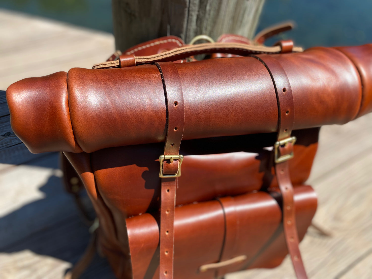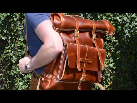 Each Rolltop Expedition Pack I make takes roughly 40 full hours of work and over 9 full square feet of leather. I design my bags to be as tough as nails so no expense is spared in in sourcing materials. I hand-stitch using the best most highly reputed Ritza Tiger thread. In terms of hardware there are 7 solid brass roller buckles, 30+ rivets, and a thick O-ring in each bag. All rivets are reinforced with "leather washers" (small leather discs harvested from leather scrap which increases density and adds significant support to the rivets). Each bag will be fully lined with an olive stretch cotton material. The rolltop design function is special for several reasons: